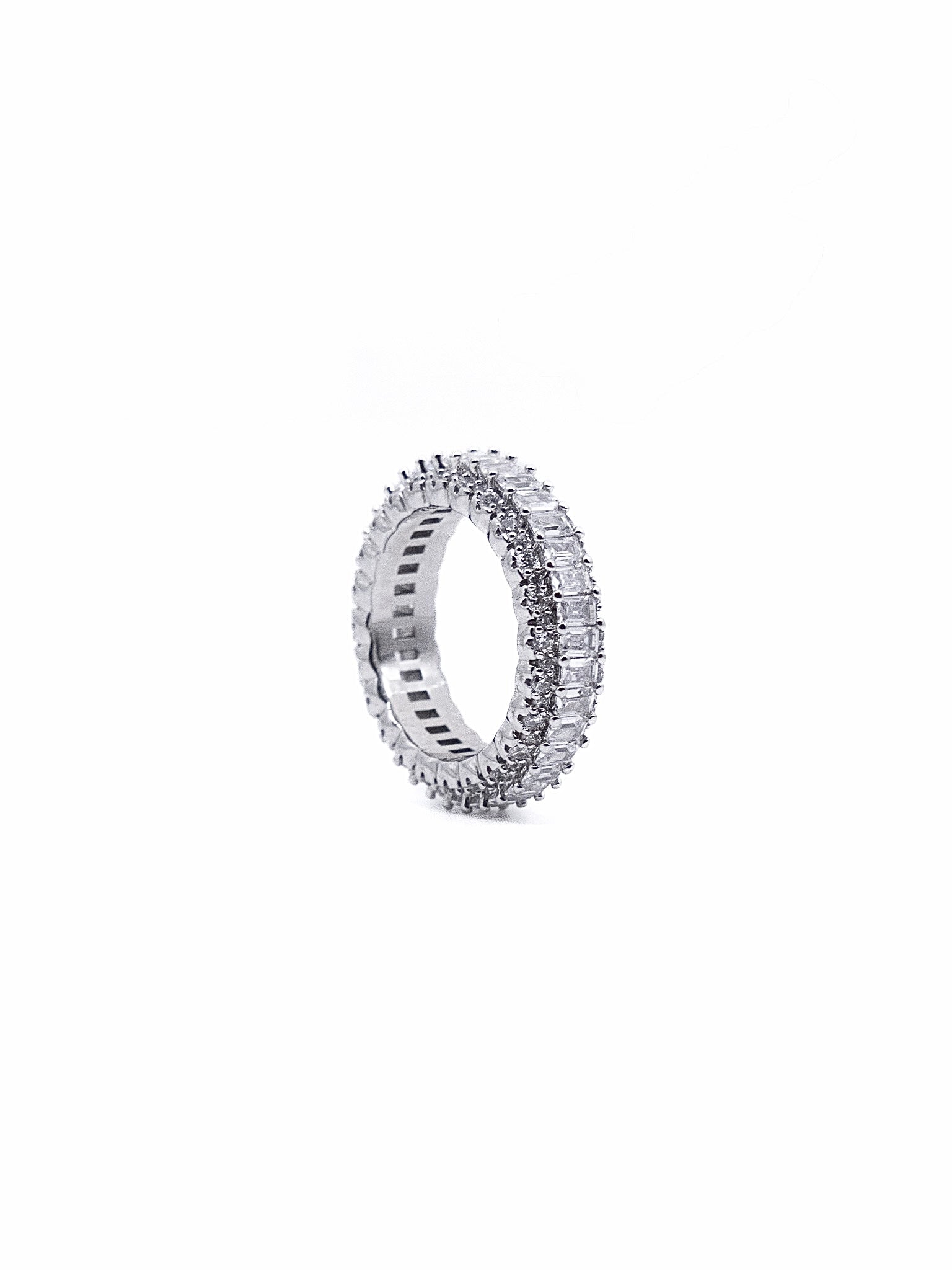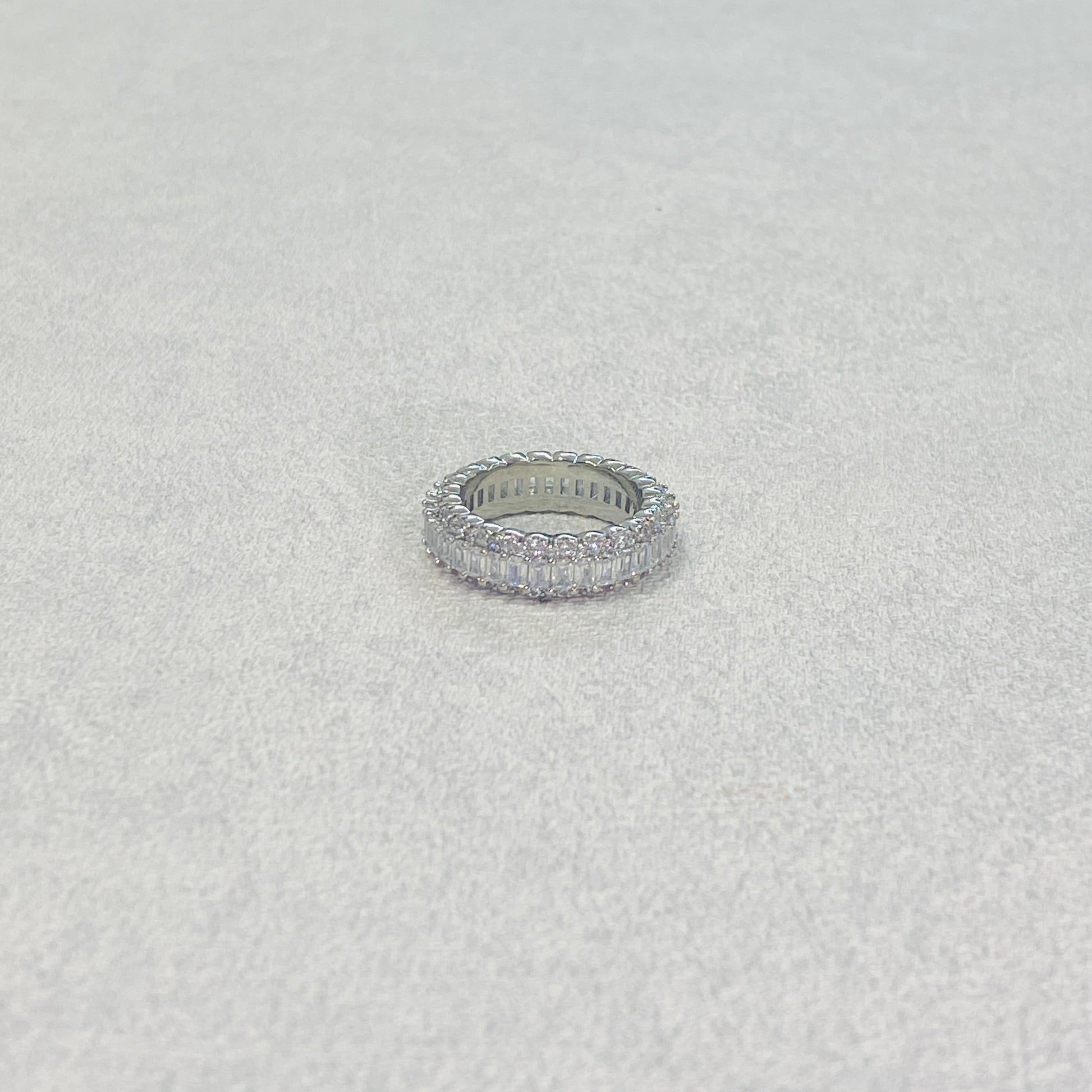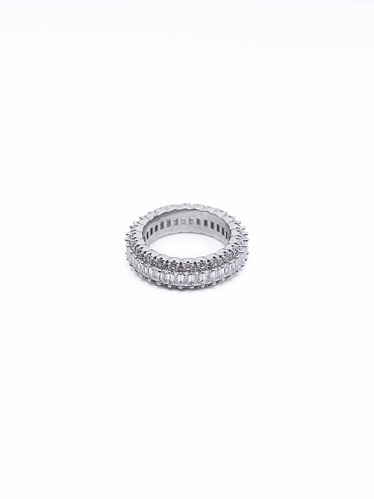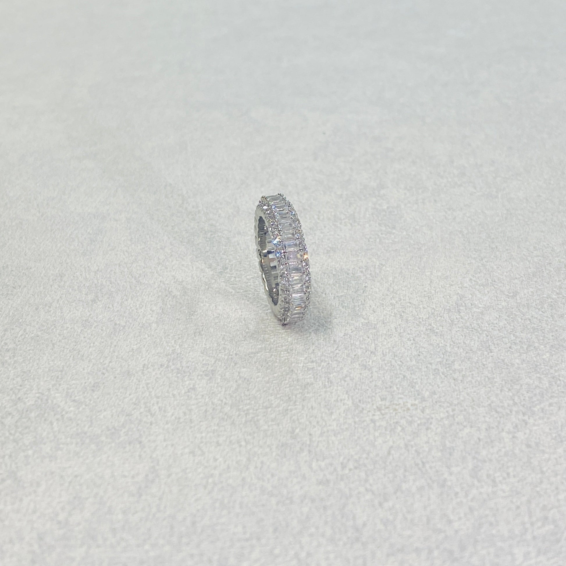 This sleek band features a striking row of baguette cut cubic ziecpnia stones framed by a delicate outer row of rount cut stones for extra brilliance. The clean lines and layered sparkle create a modern yet timeless design