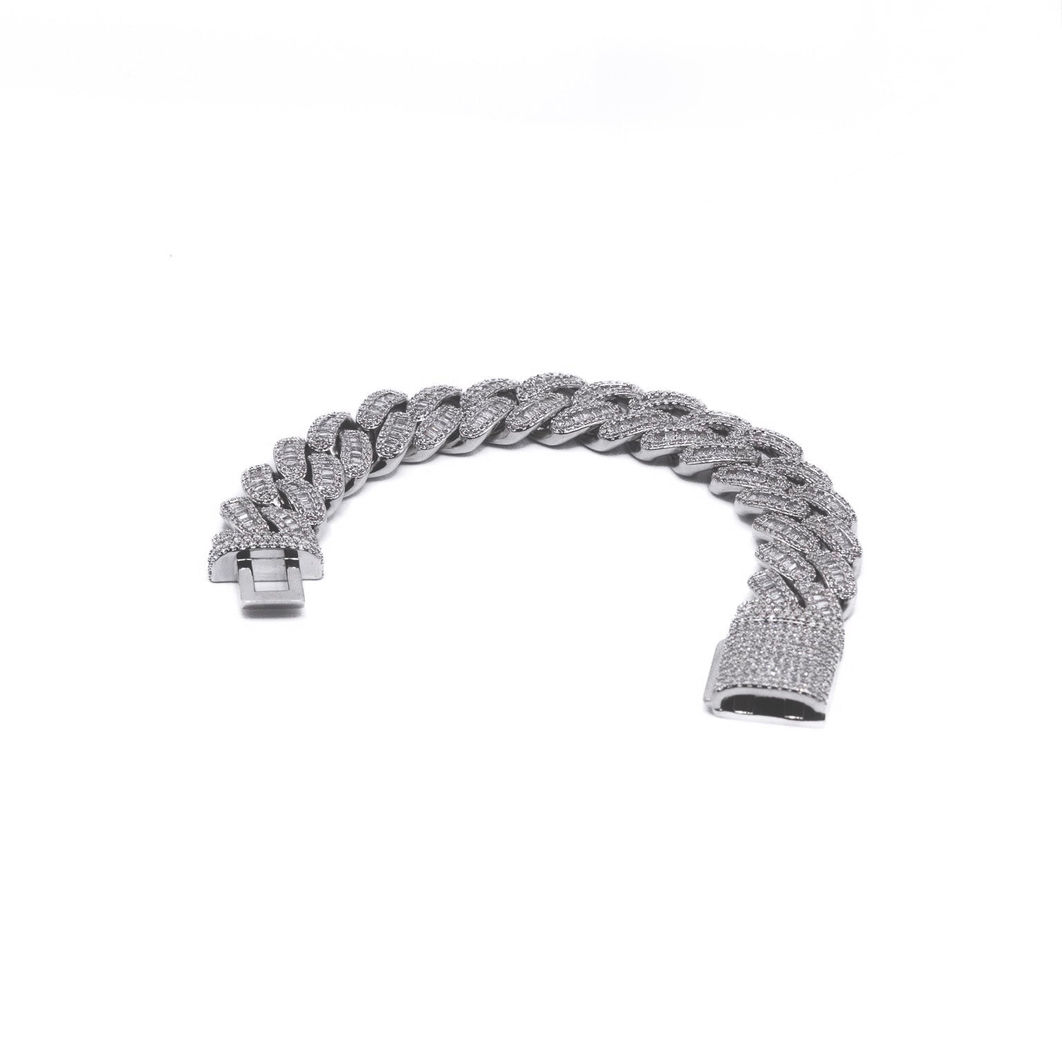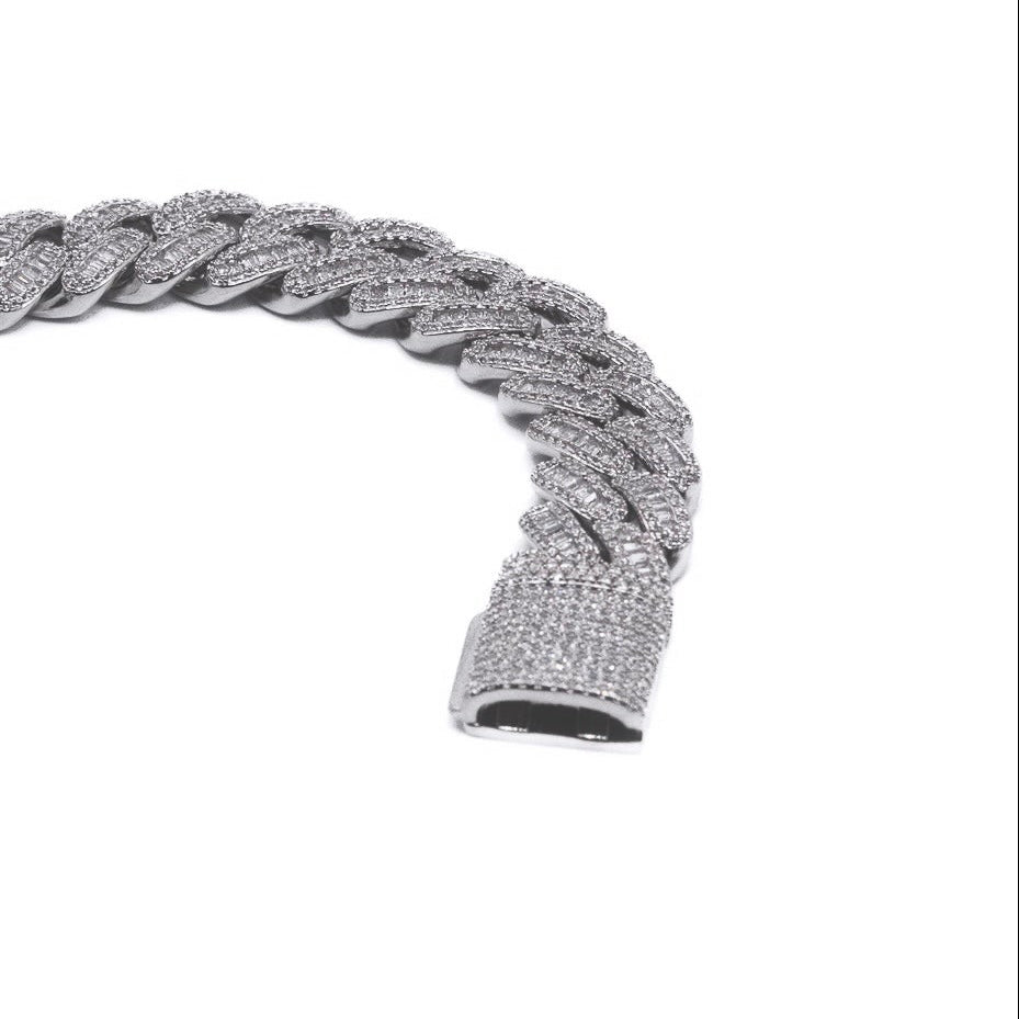 Cuban-style links that are fully encrusted with baguette cut CZ stones, crafted for weight and shine. Its solid clasp and interlocking build ensure standout durability and fit.