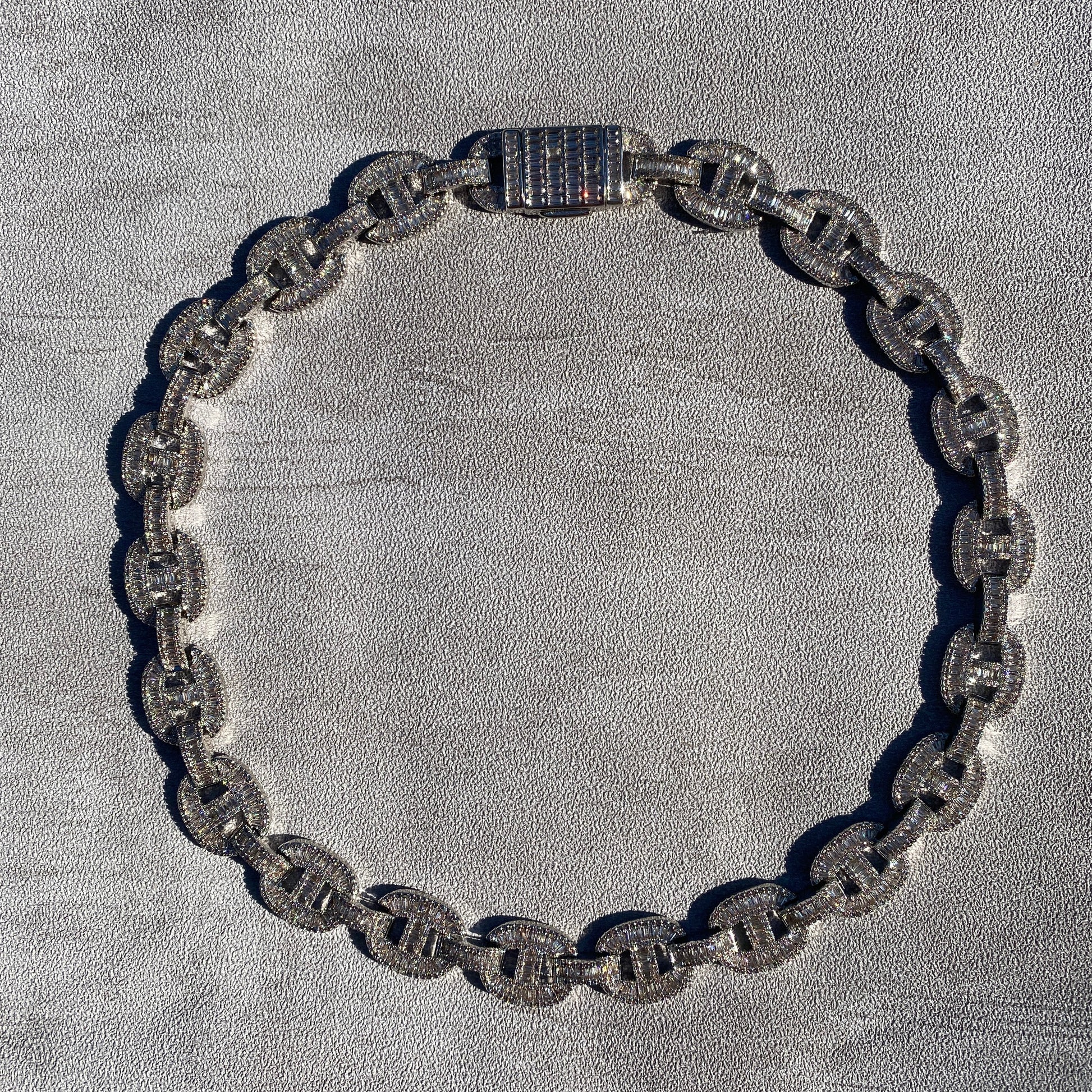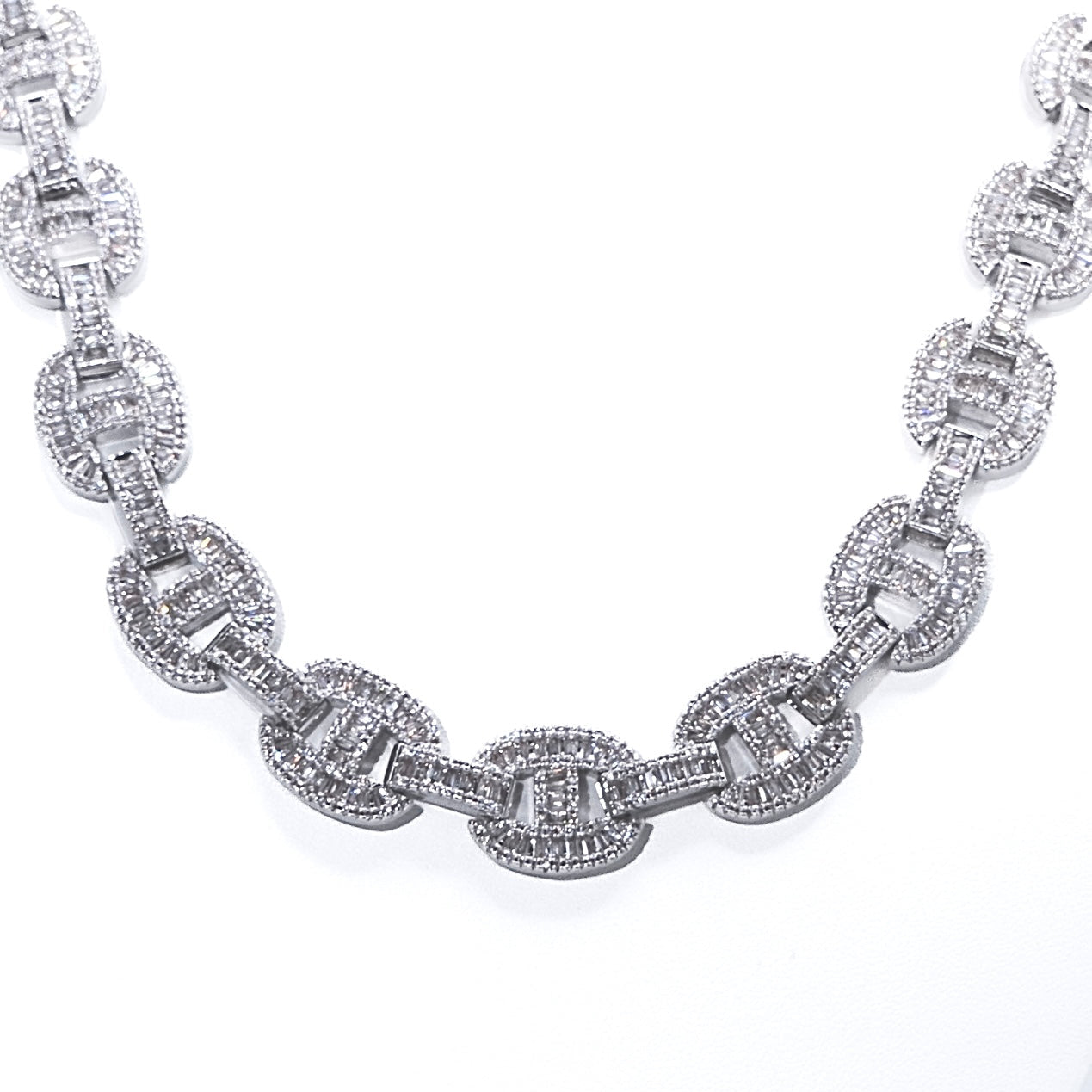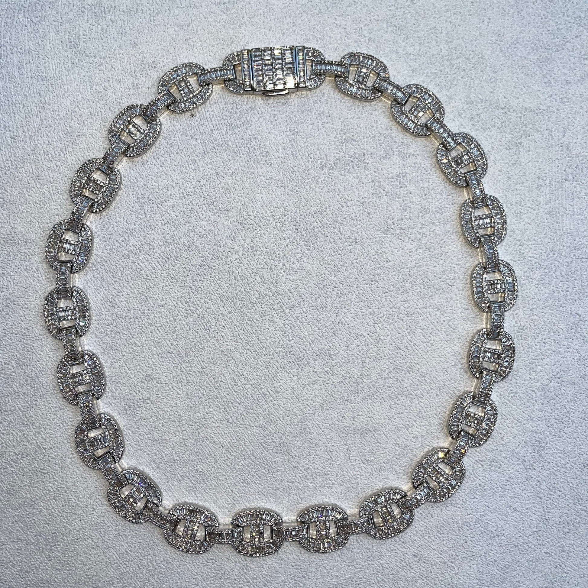 A chunky, flat-faced link chain featuring bold oval links blended with iced out bridges. The double layered design combines smooth polished edges with intricate stone settings , giving the chan extra dimension and a luxury appeal. This piece has a heavyweight feel and makes a statement either alone or layered.