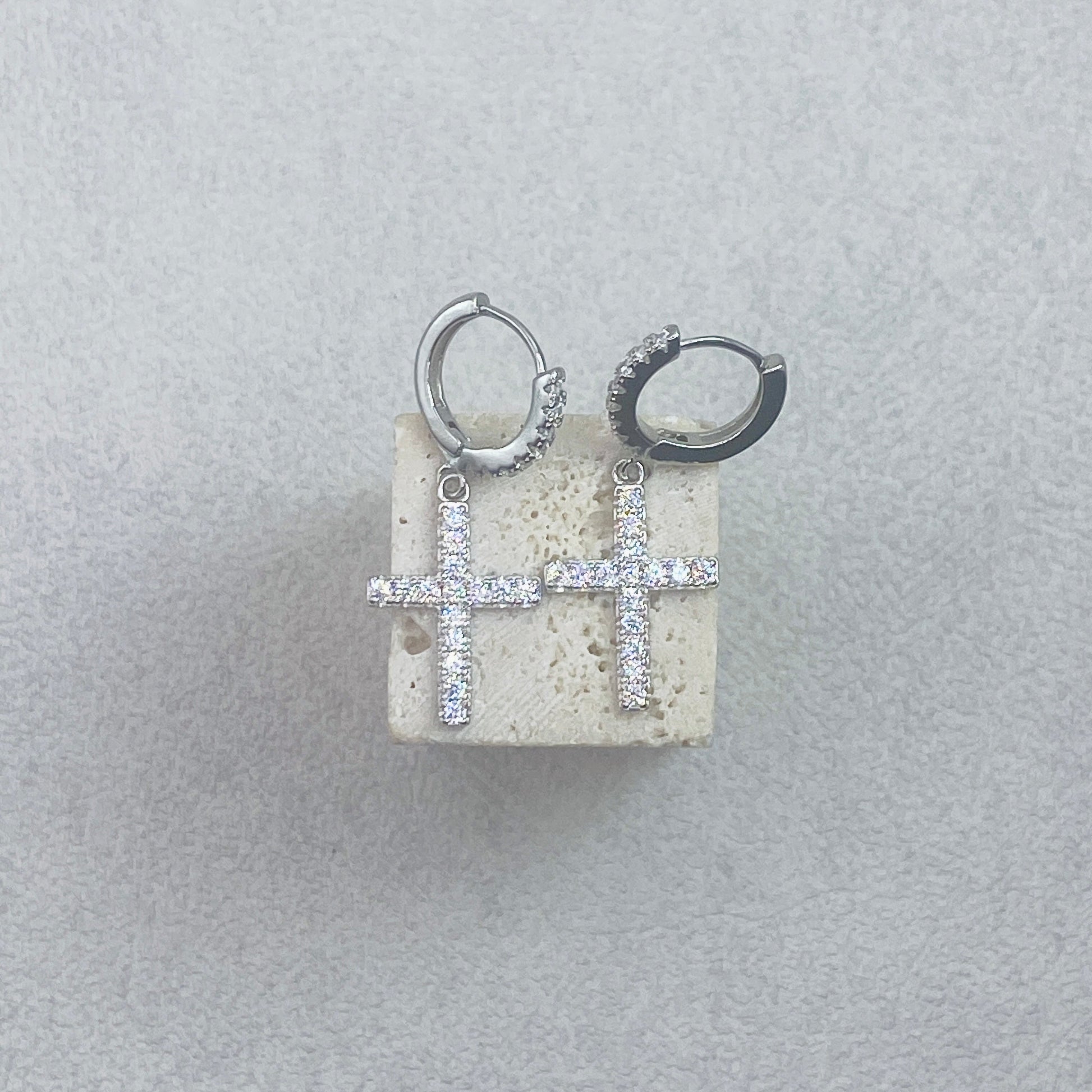 Modern hoop earrings featuring intricate micro pave details and cross charms for a stylish and meaningful accessory. Great for layering with other earrings for a curated ear look.