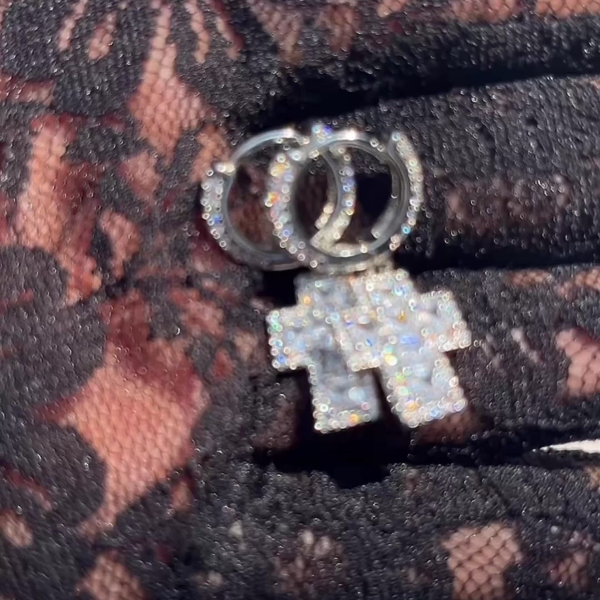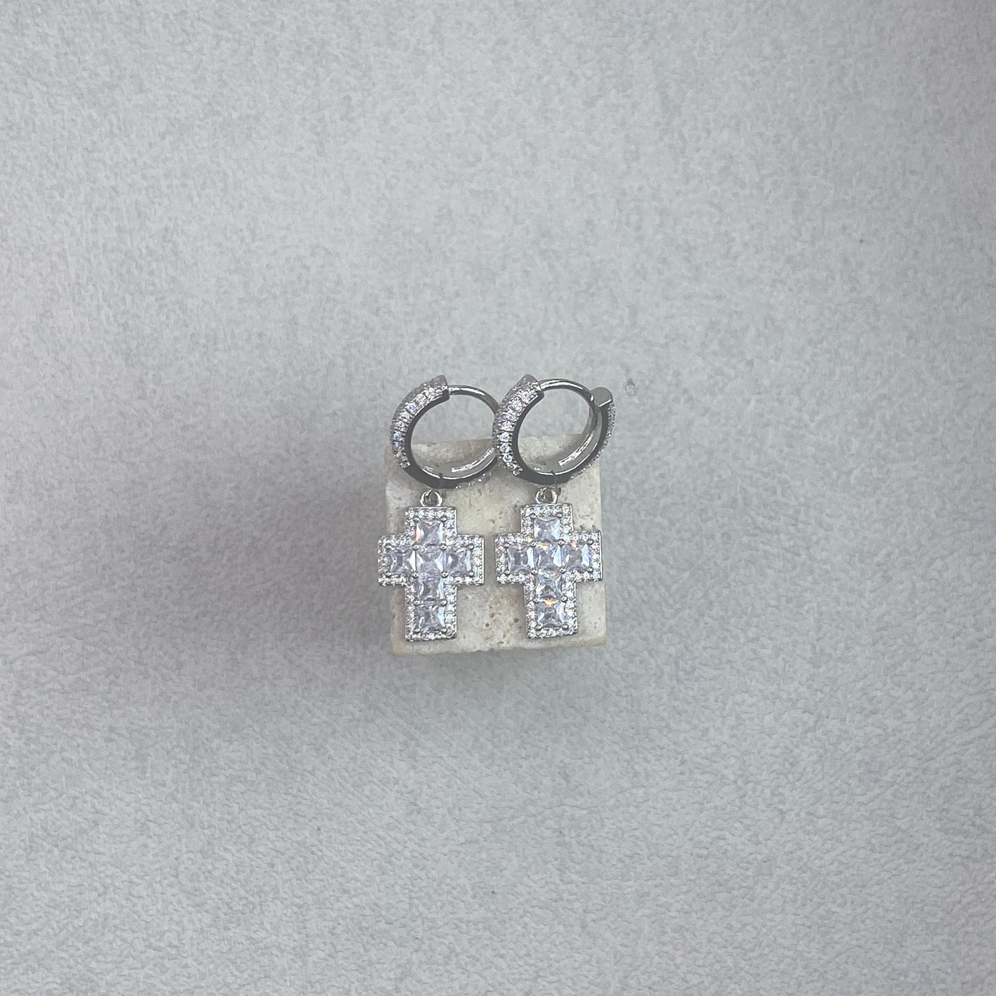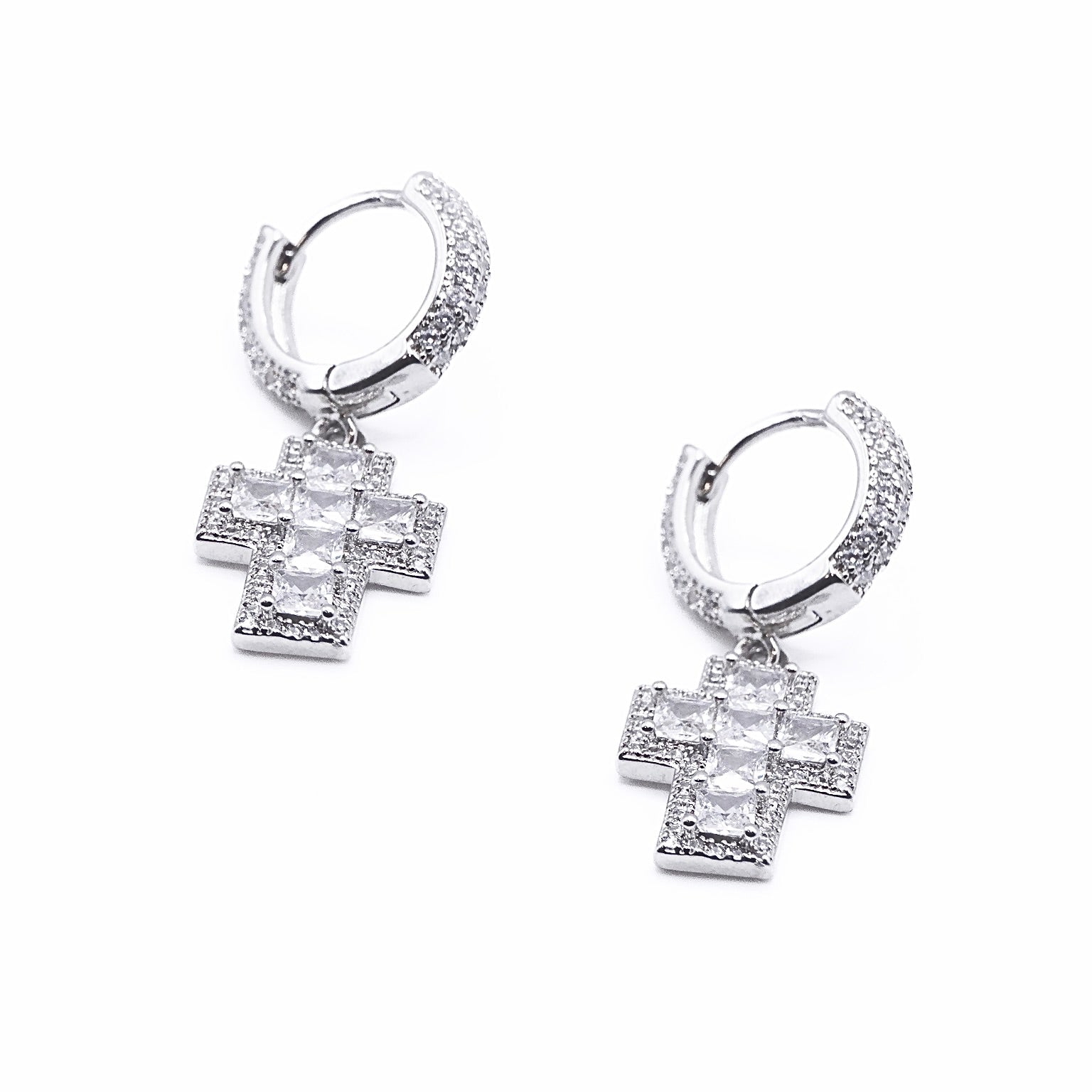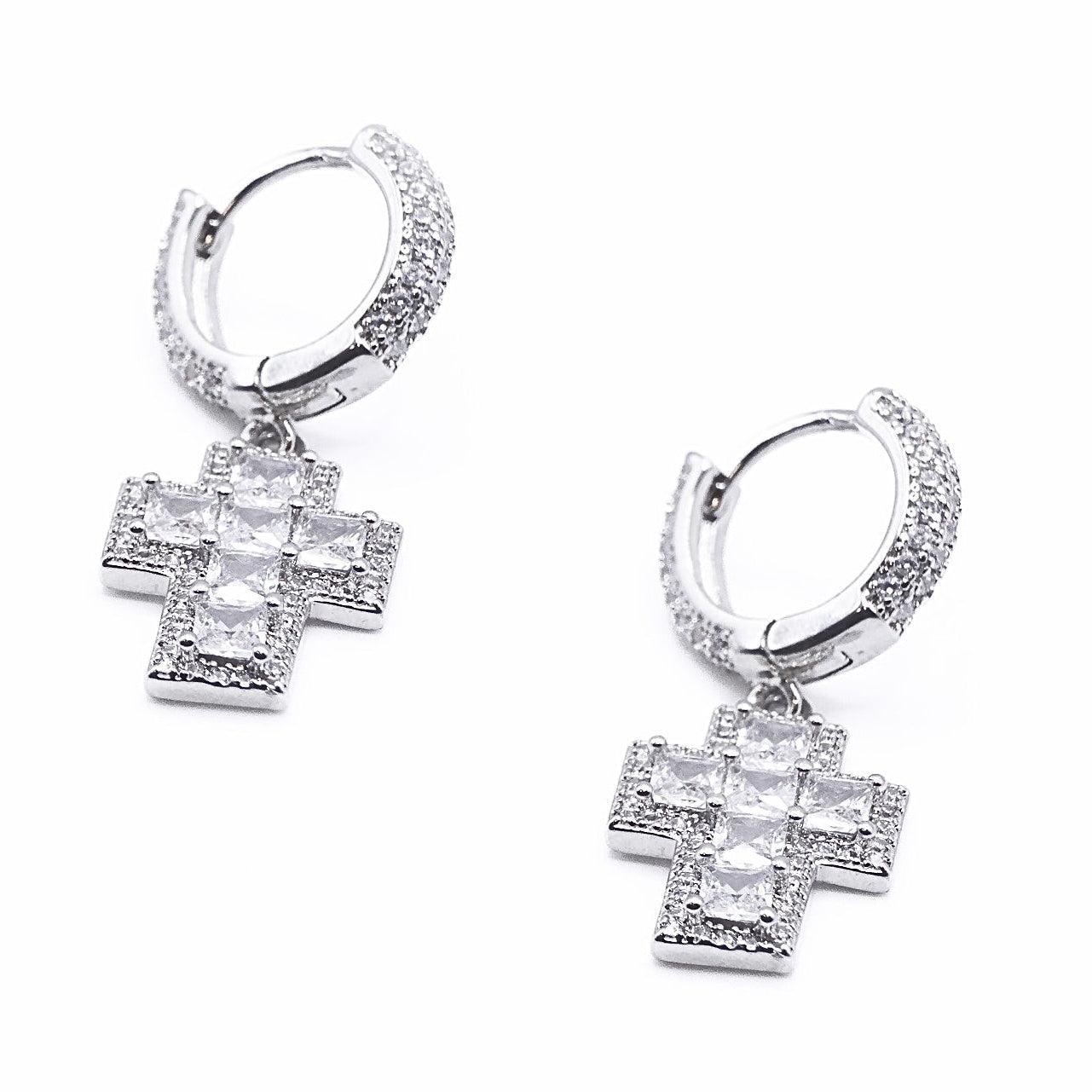 Stylish hoop earrings adorned with shimmering pavé stones and a bold cross charm for a statement-making accessory. Crafted with high-quality materials for lasting shine and durability.