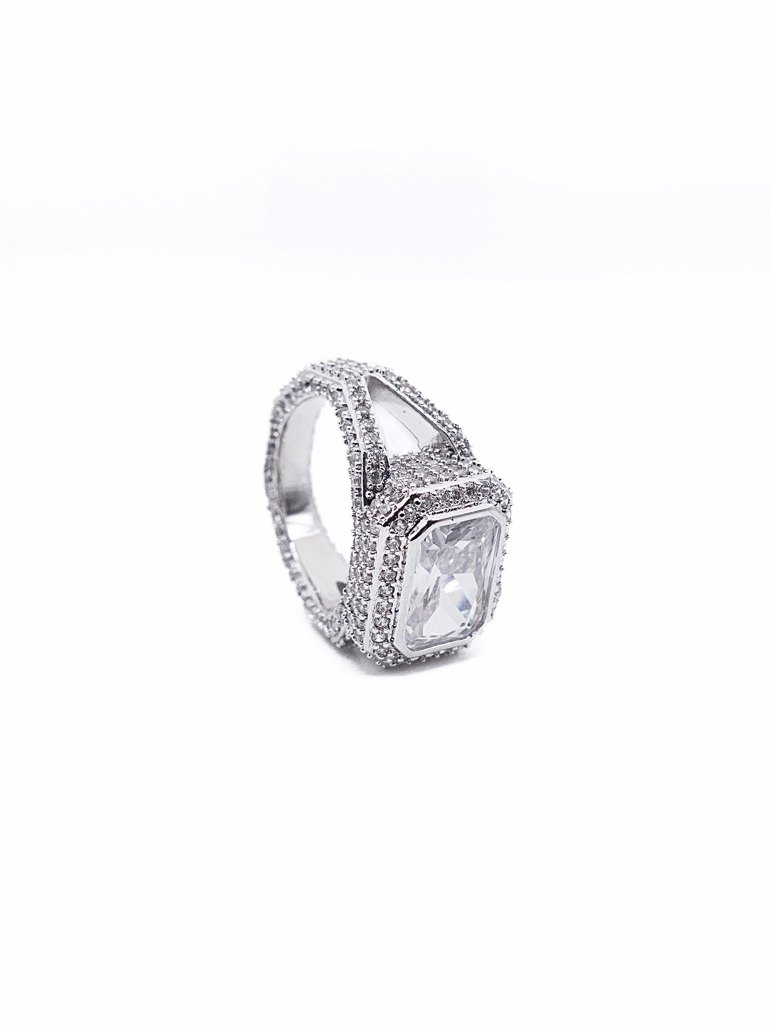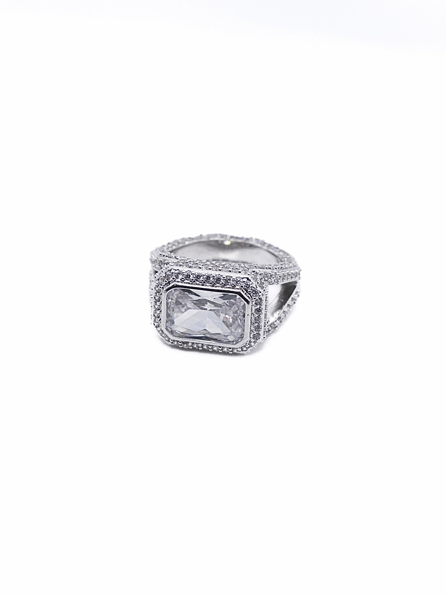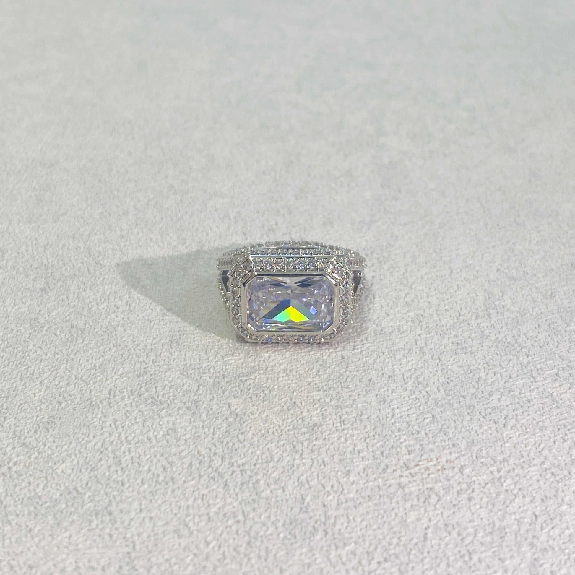 A bold rectangle face ring centred with a radiant-cut CZ, clean and luxurious.