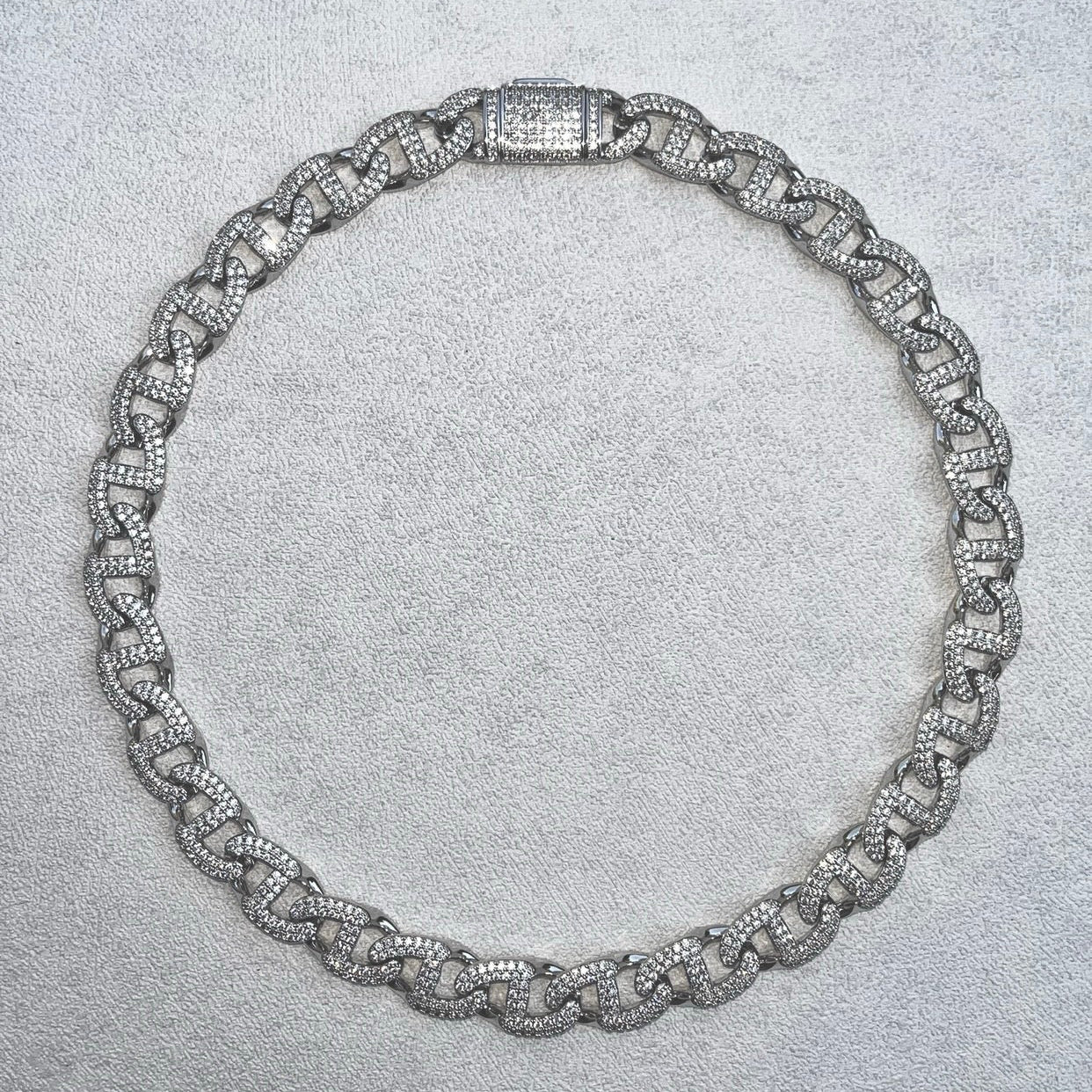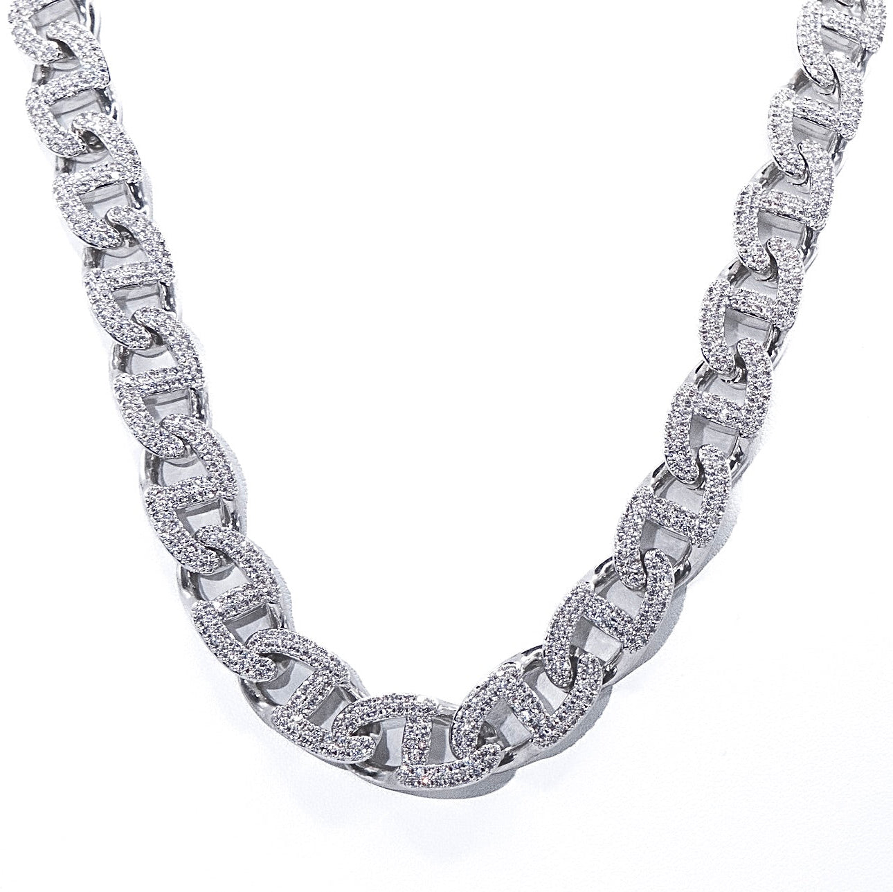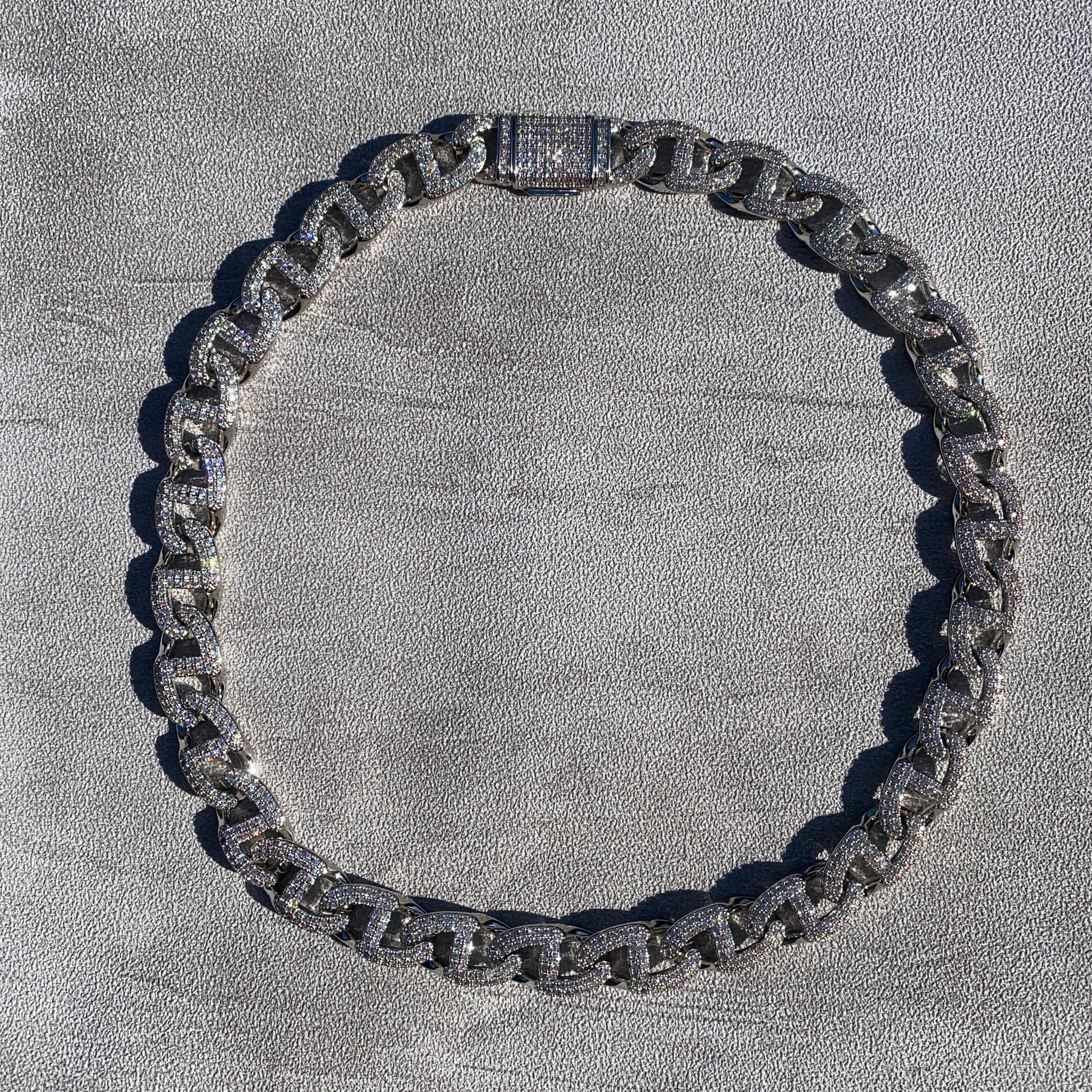 A flat interlocking structure that gives this piece a substantial feel. Dense accurate stone placements designed to maximize brilliance. The smooth Cuban features a wide profile , perfect for an attentive radiance.