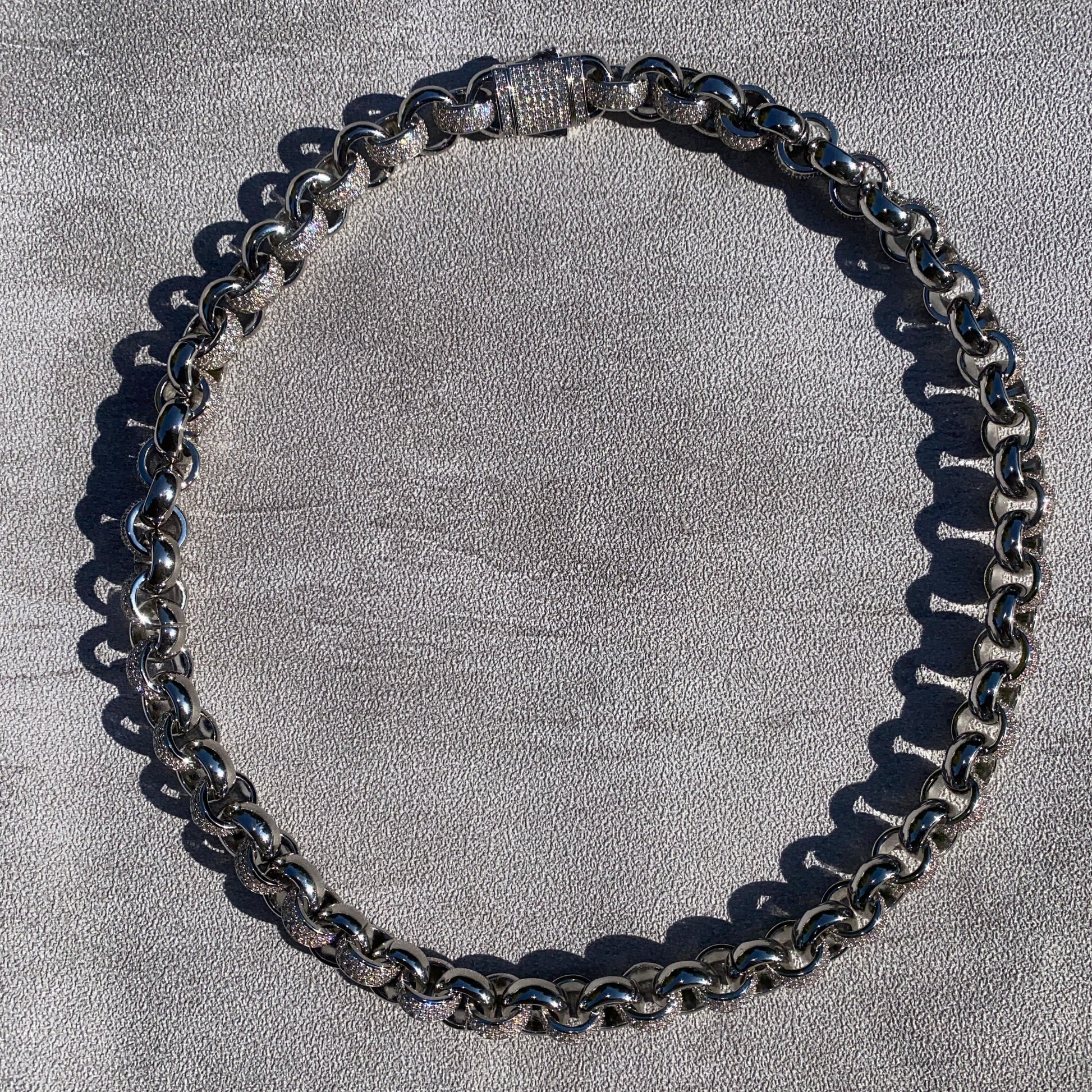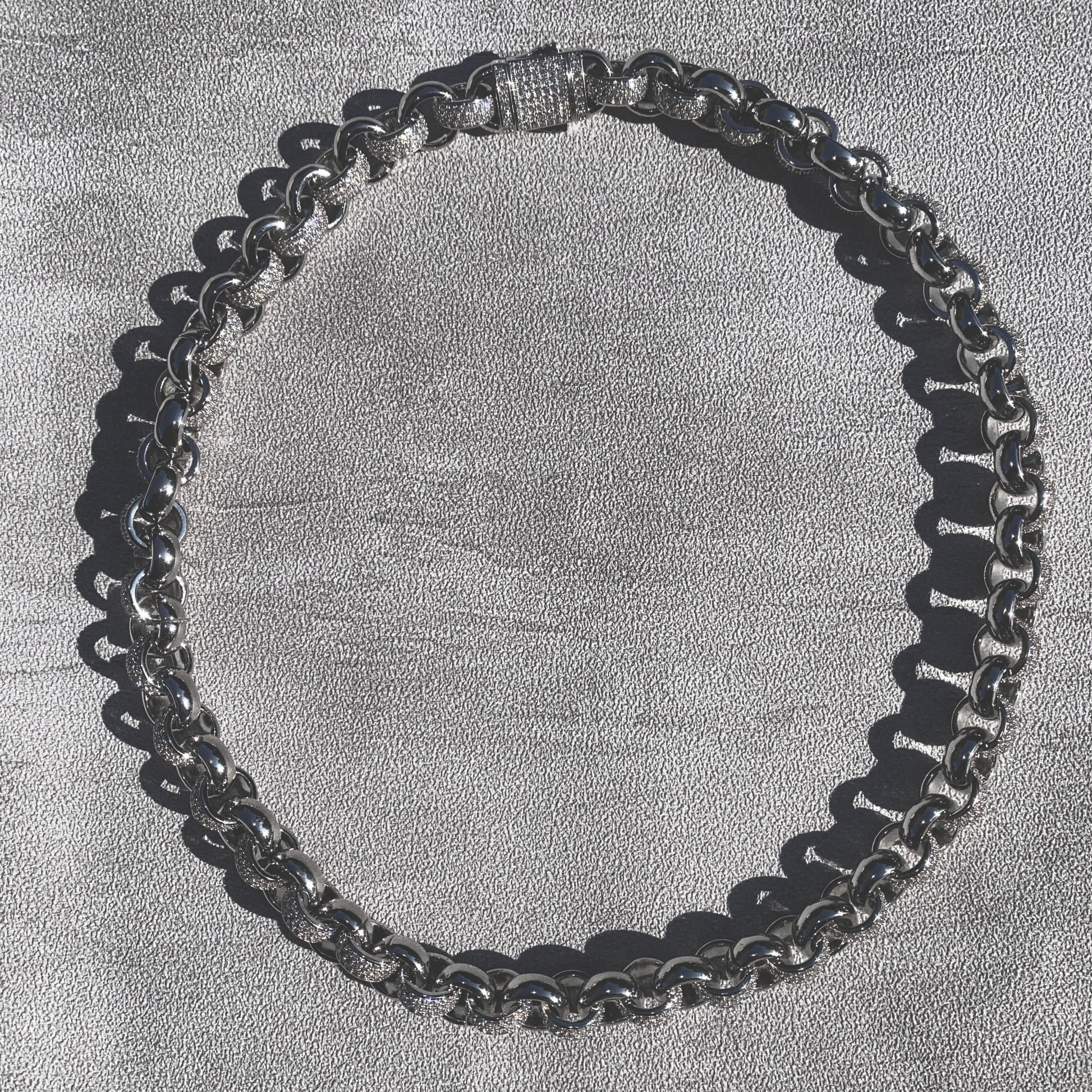 Curb links with an alternating pattern of fully micro leaves links.Creating A dramatic contrast between textures ,medium weighted and sculpted for its presence on the neckline. An easy choice when looking for high impact.